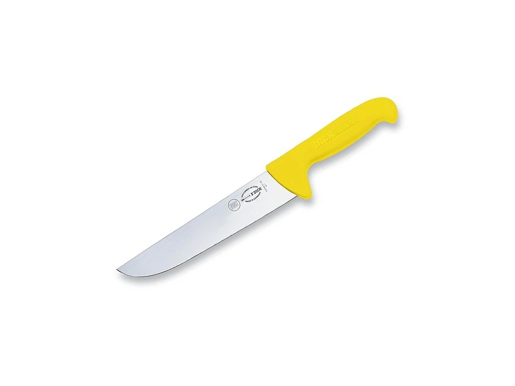 Profesionální řeznický nůž F. Dick ErgoGrip 8234818-02 má širokou a stabilní čepel délky 18 cm z nerezové oceli X55CrMo14 o tvrdosti 56 HRC. Vyznačuje se ergonomickou rukojetí ze žlutého plastu pro pohodlný a bezpečný úchop i v mokrém prostředí. Mezi čepelí a rukojetí se nenacházejí žádné spáry, ve kterých by se mohly zachytit tekutiny. Rukojeť neabsorbuje mastnotu ani nečistoty.