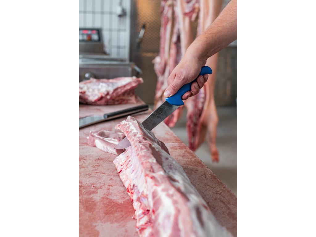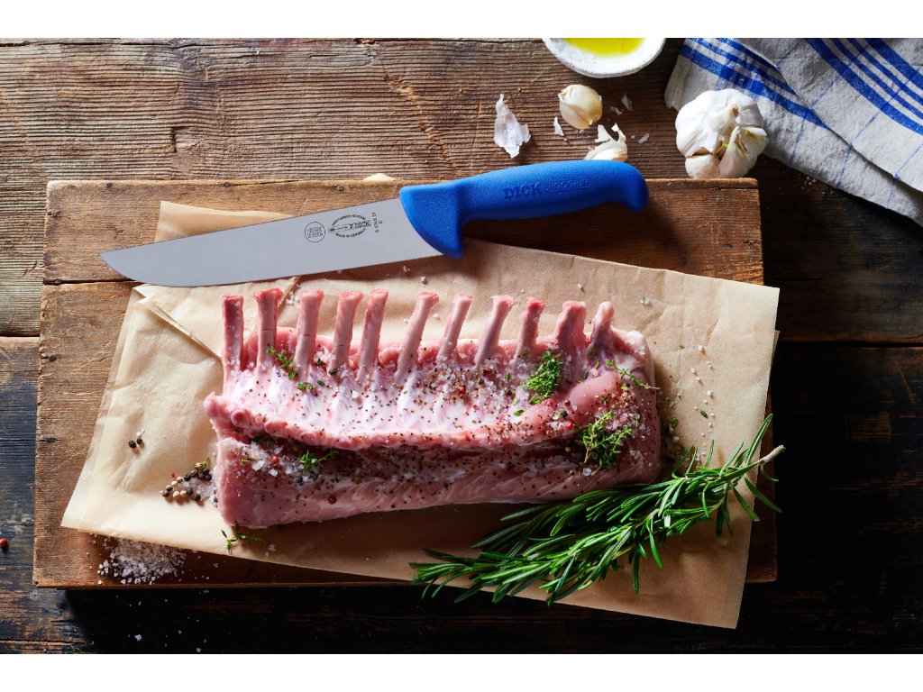 Profesionální řeznický nůž F. Dick ErgoGrip 8234821 má širokou a stabilní čepel délky 21 cm z nerezové oceli X55CrMo14 o tvrdosti 56 HRC. Vyznačuje se ergonomickou rukojetí z modrého plastu pro pohodlný a bezpečný úchop i v mokrém prostředí. Mezi čepelí a rukojetí se nenacházejí žádné spáry, ve kterých by se mohly zachytit tekutiny. Rukojeť neabsorbuje mastnotu ani nečistoty.