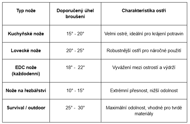 Pro různé typy nožů se doporučují rozdílné úhly broušení: