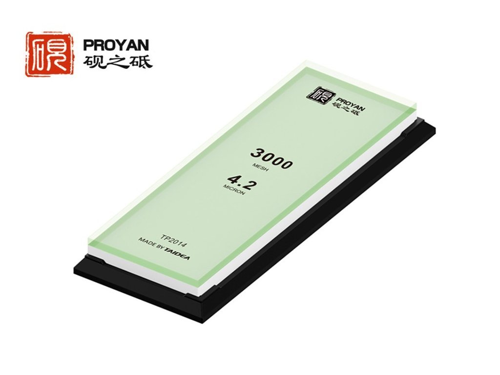 Vodní brusný kámen, zrnitosti 3000. Kámen má na spodní části základnu z tvrzeného skla. Díky tomu je kámen bez deformací a nehrozí jeho ohnutí. Běžné brusné kameny se mohou mikroskopicky deformovat absorbováním vody, ale kameny Taidea Glass Stone řeší tento problém svojí extrémně plochou základnou z tvrzeného skla. Další výhodou skleněné základny je, že zrnitost na spodní straně je vždy viditelná i po dlouhém používání. Rozměr brusné plochy je 20 x 7 cm, díky čemuž na kameni pohodlně nabrousíte i větší nože. Kámen je uložen v plastovém podstavci. Protiskluzové nožičky na podstavci zajišťují bezpečné a stabilní broušení. Tento brusný kámen nabrousí kapesní i pevné nože všech druhů a lze jej použít i na kuchyňské nože.