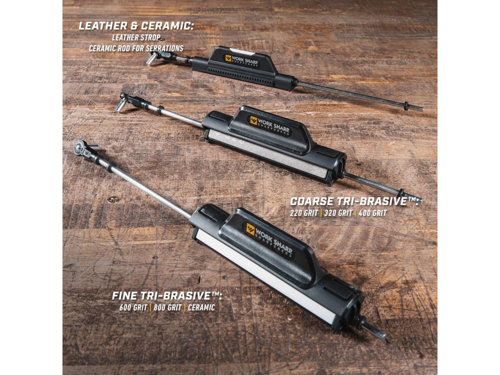 Brusná souprava Work Sharp Benchtop Precision Adjust Elite je komplexní a snadno nastavitelný brusný systém na nože. Obsahuje tři brusné sestavy na vodicích tyčkách. První sestava obsahuje otočný třístranný diamantový brusný kámen – zrnitost 220, 320 a 400. Druhá sestava obsahuje otočný třístranný brusný kámen – zrnitost 600 a 800 (diamant) a velmi jemná keramika. Třetí sestava obsahuje kůži na obtahování a malou brusnou tyčku na broušení zubatého ostří.