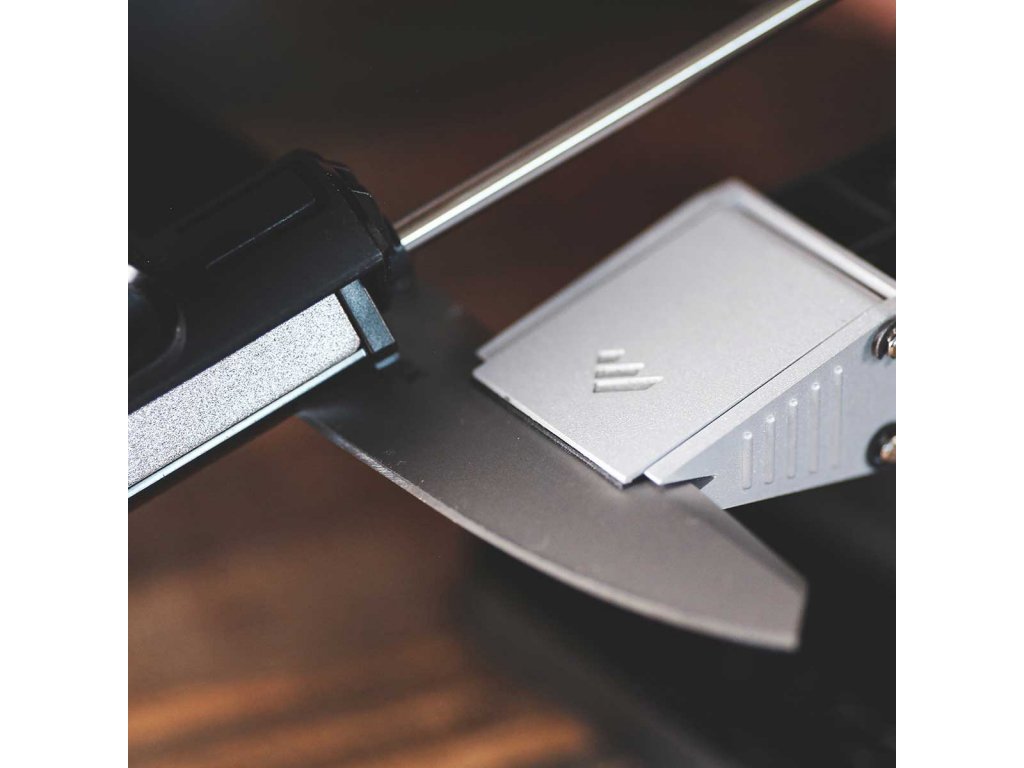 Úhel broušení lze plynule nastavit pomocí šroubu v rozmezí 15 - 30°. Svorka pro uchycení nože je také otočná, díky čemuž nemusíte nůž neustále vybírat ze svorky. Jednoduše svorku otočíte a brousíte druhou stranu nože. Svorka má v čelistech gumové vložky, které chrání nůž před poškrábáním. Sada je velmi jednoduchá na použití a bez problémů s ní doma nabrousíte své nože.