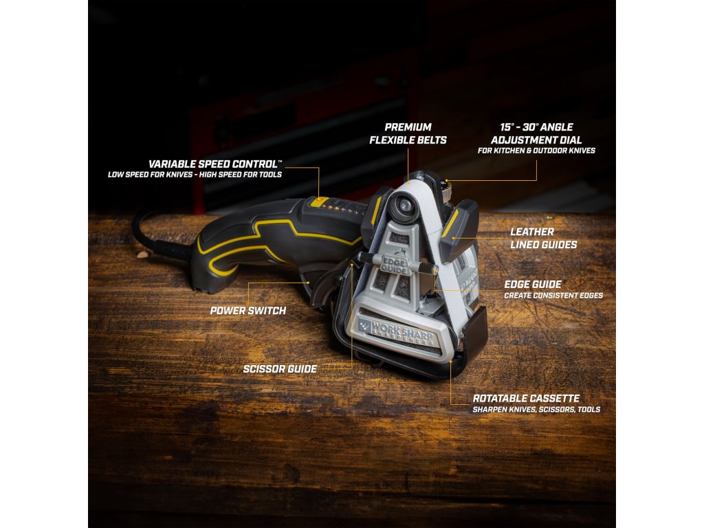 Elektrická bruska na nože Work Sharp Ken Onion Edition Knife & Tool Sharpener Mk.2 je komplexní elektrický brusný systém, který vám umožní nabrousit téměř každý nůž nebo nůžky, sekeru a jiné nástroje. Bruska nabízí nastavitelný úhel broušení v rozmezí 15 - 30°, nastavitelnou rychlost pásu - sedm rychlostí, a pět různých brusných pásů - zrnitosti 120, 220, 1000, 3000 a 6000.