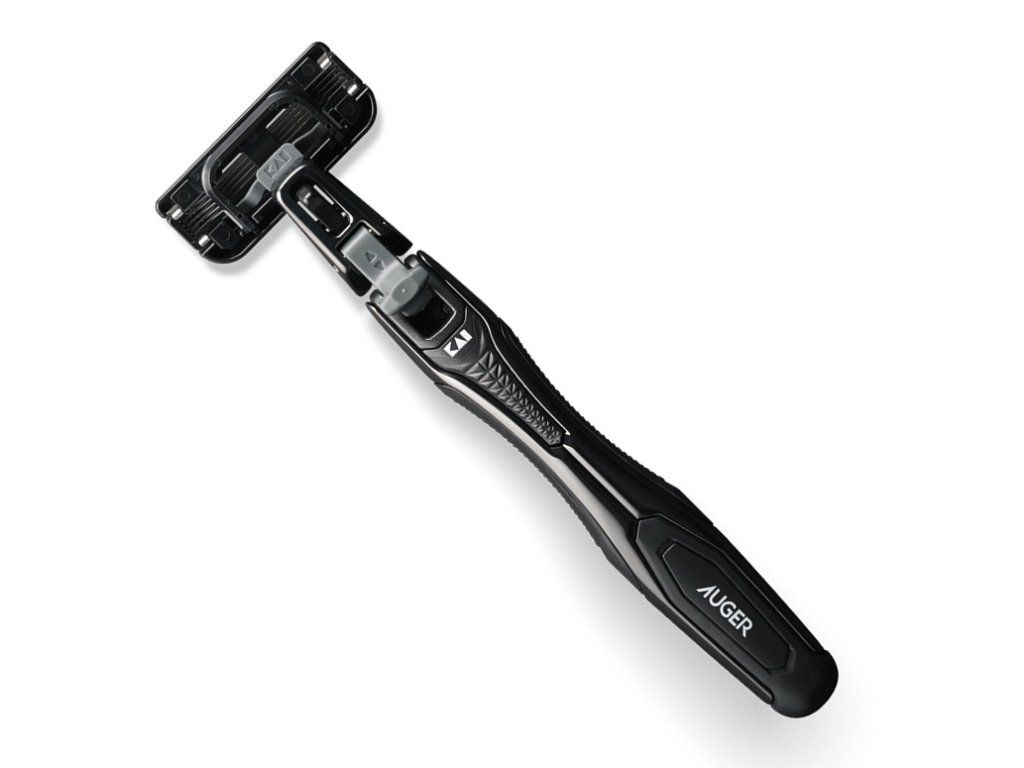 Elegantní a vysoce kvalitní holicí strojek KAI Auger má vyměnitelnou hlavici s pěti břity z nerezavějící oceli. Tělo je ze zinkové chromované slitiny, ABS pryskyřice, termoplastického elastomeru a polycetálu. Kombinace těchto materiálů zaručuje bezpečný a pohodlný úchop během používání. Vrch těla má otočnou plochu se zdvihatelnou hlavou pro bezproblémové oholení i těch náročněji dostupných částí obličeje.