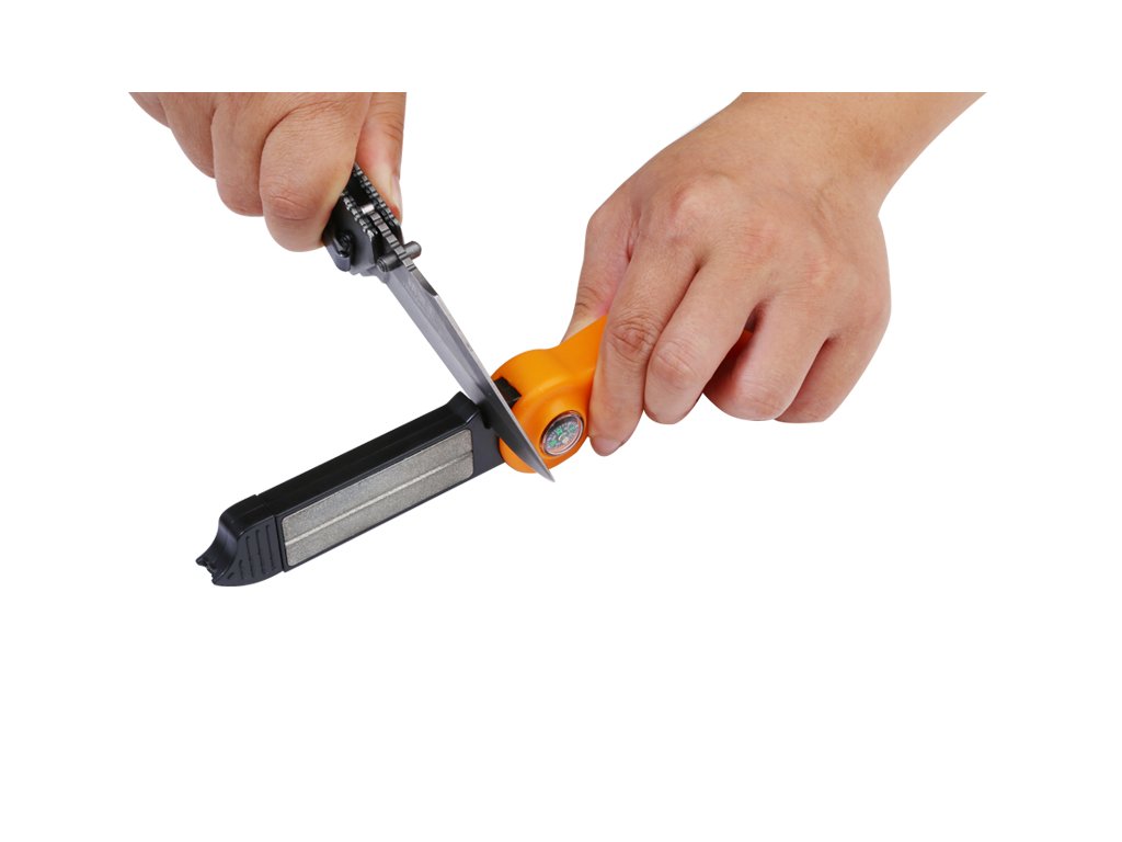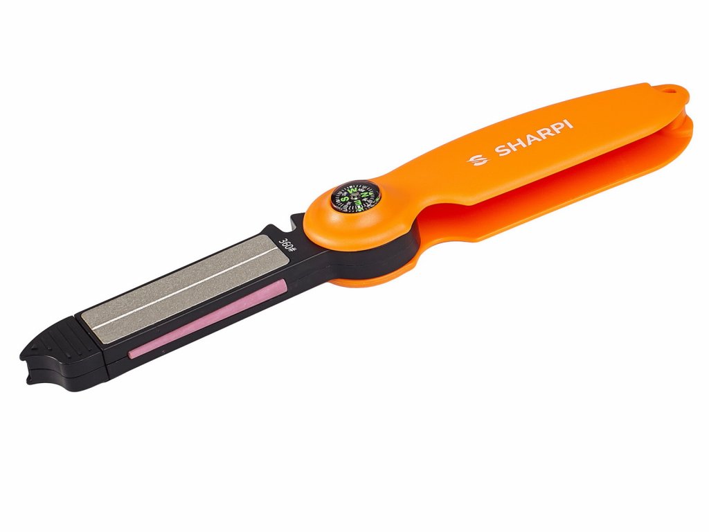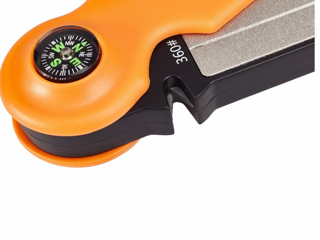 Jednoduchá kapesní bruska s několika funkcemi. Nabrousí nože, nůžky, zahradní nářadí i rybářské háčky.