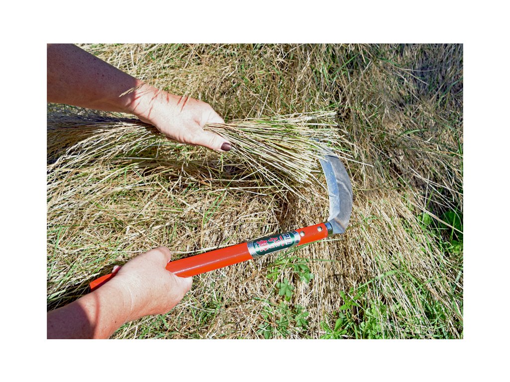 Čepel tloušťky 2 mm je z vysokouhlíkové japonské oceli Izumo Yasugi, která se snadno brousí a dosahuje tvrdosti 60 - 61 HRC, díky čemuž srp vydrží výjimečně dlouho ostrý. Dřevěná rukojeť délky 33,5 cm je ve výrazné červené barvě, která usnadňuje jejich viditelnost i ve vysoké trávě.