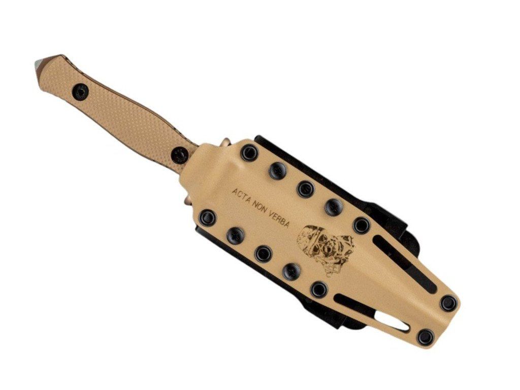 Rukojeť z pískové (coyote) G10 s agresivní strukturou a vroubkováním po obvodu zaručí pevný úchop v rukavicích i ve vlhkém prostředí. Rukojeť je zakončena hrotem, který slouží k rozbití skla či jiných materiálů.