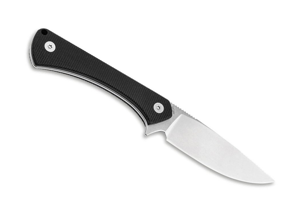 Full-tang čepel délky 7,2 cm z nerezové oceli Sandvik 14C28N. Jemně vroubkovaná rukojeť z černé G10.