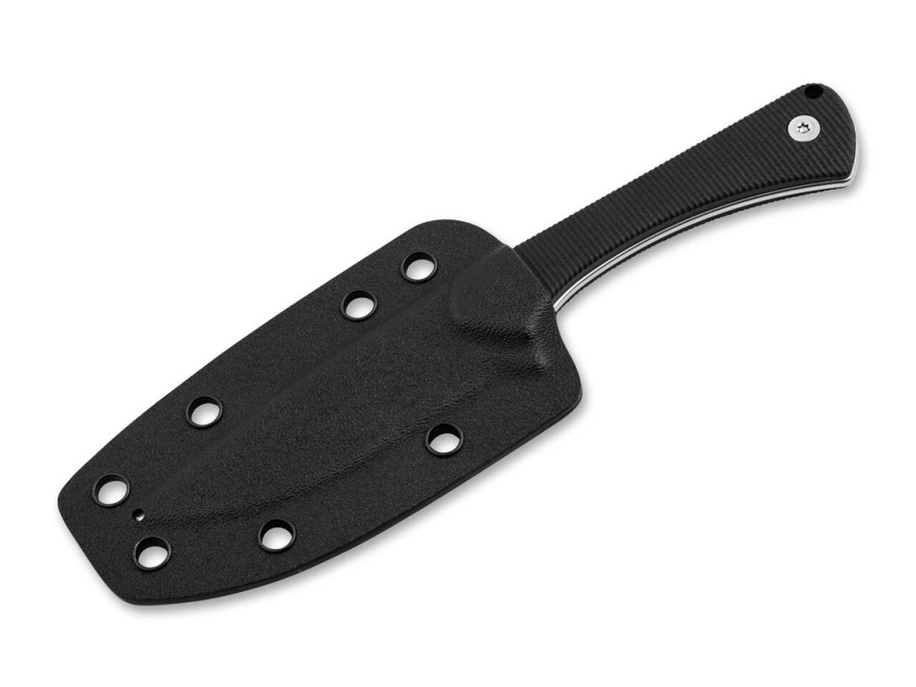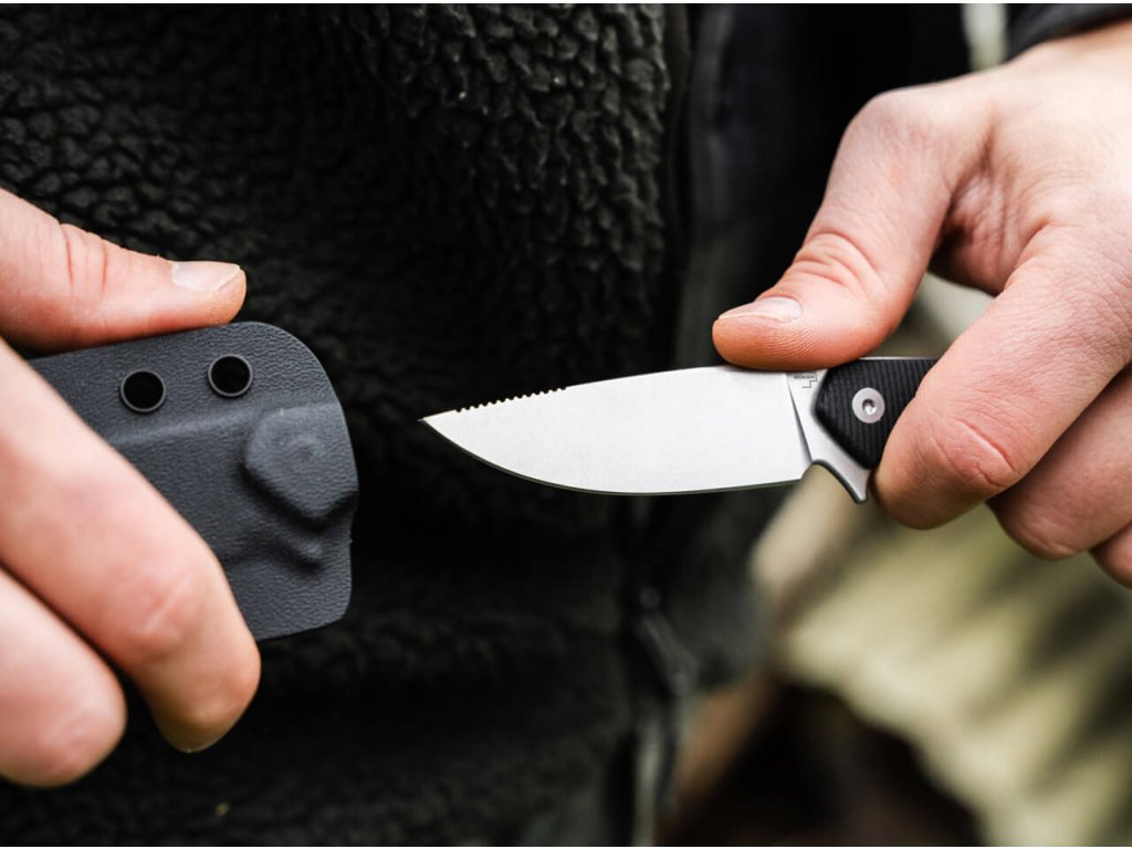 Součástí balení je černé kydexové pouzdro s přiloženým klipem na zavěšení na opasek.