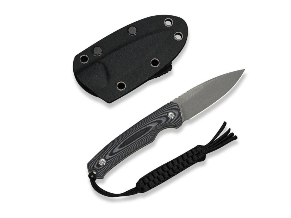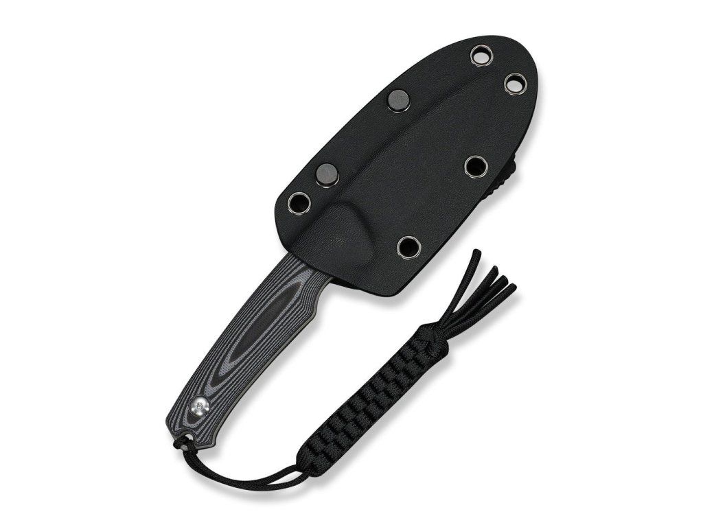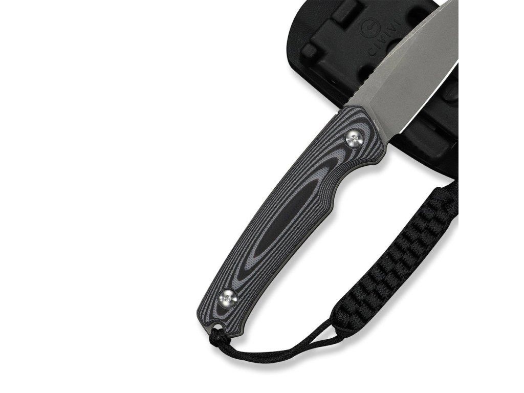 Ergonomická rukojeť z černé a šedé vzorované G10. Na konci rukojeti je zapleten paracord černé barvy.