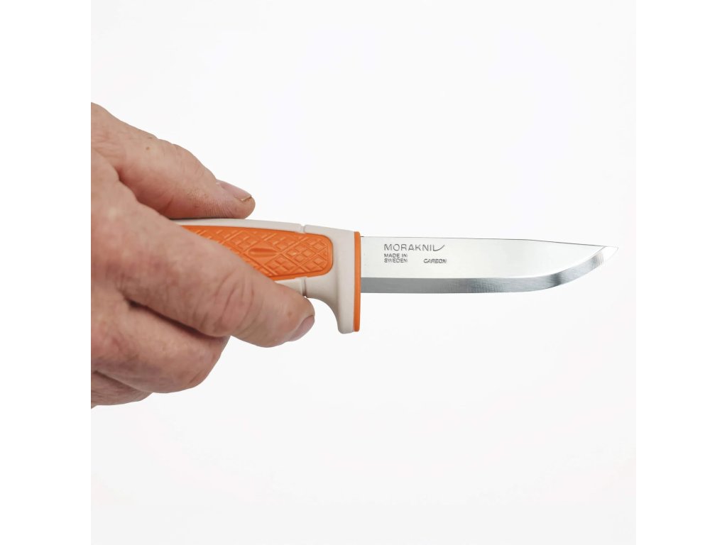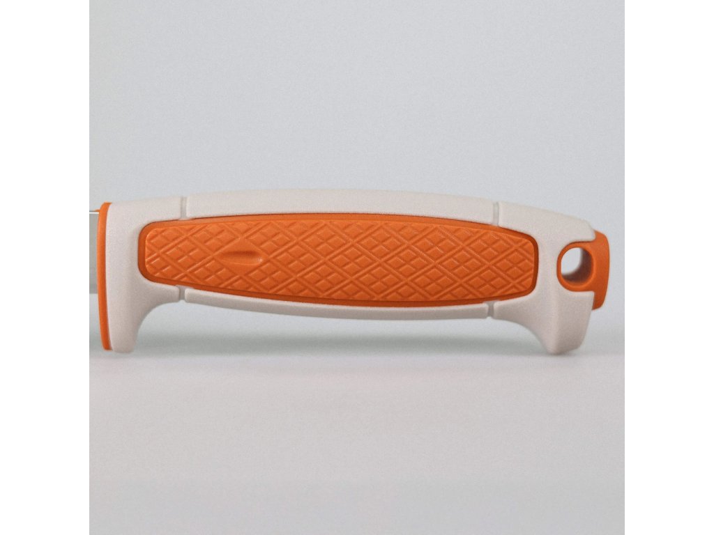Válcovitá ergonomická rukojeť z odolného polypropylenu v béžovo-oranžové barevné kombinaci je inspirována klasickými řemeslnickými noži Morakniv. Na rukojeti se nachází plocha s protiskluzovou úpravou, na konci je otvor na paracord (lanyard hole).
