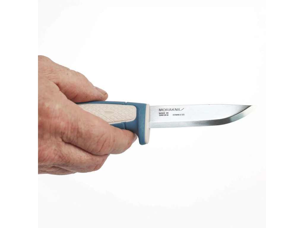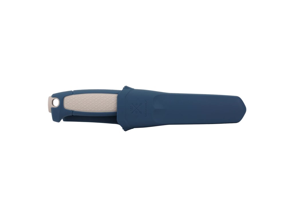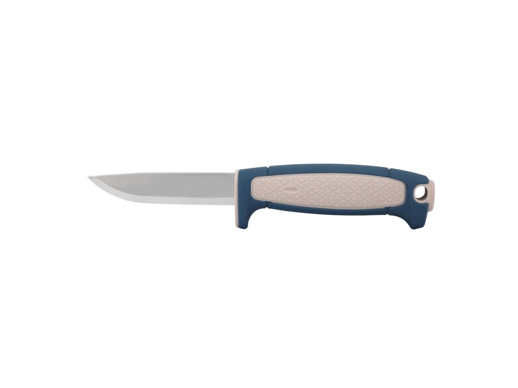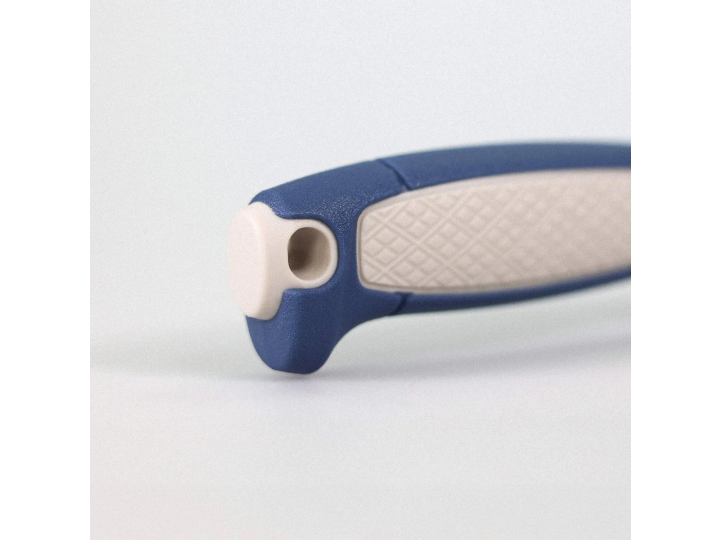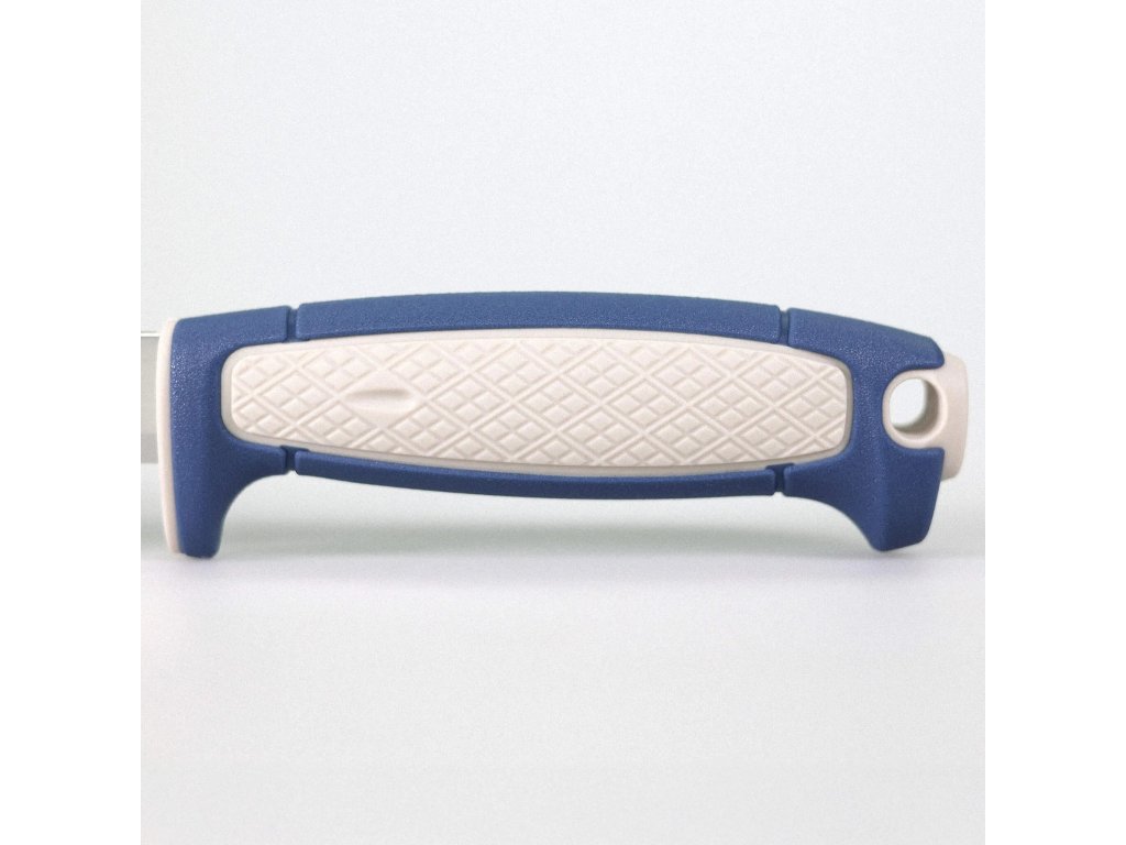Válcovitá ergonomická rukojeť z odolného polypropylenu v tmavě modré a béžové barevné kombinaci je inspirována klasickými řemeslnickými noži Morakniv. Na rukojeti se nachází plocha s protiskluzovou úpravou, na konci je otvor na paracord (lanyard hole).