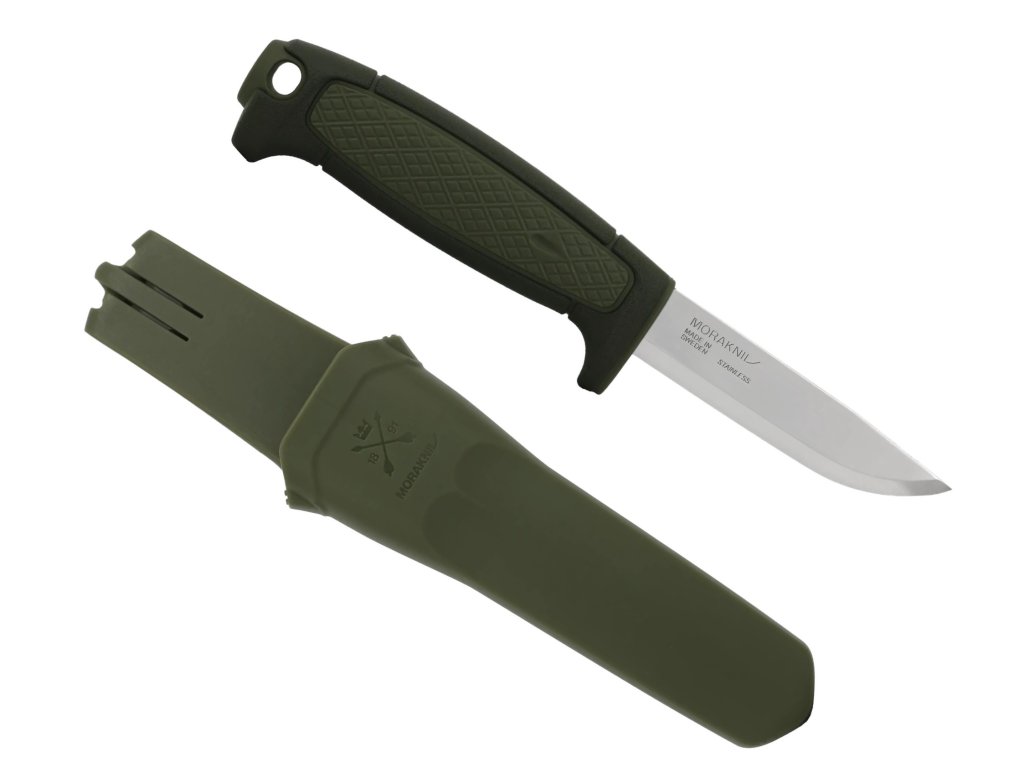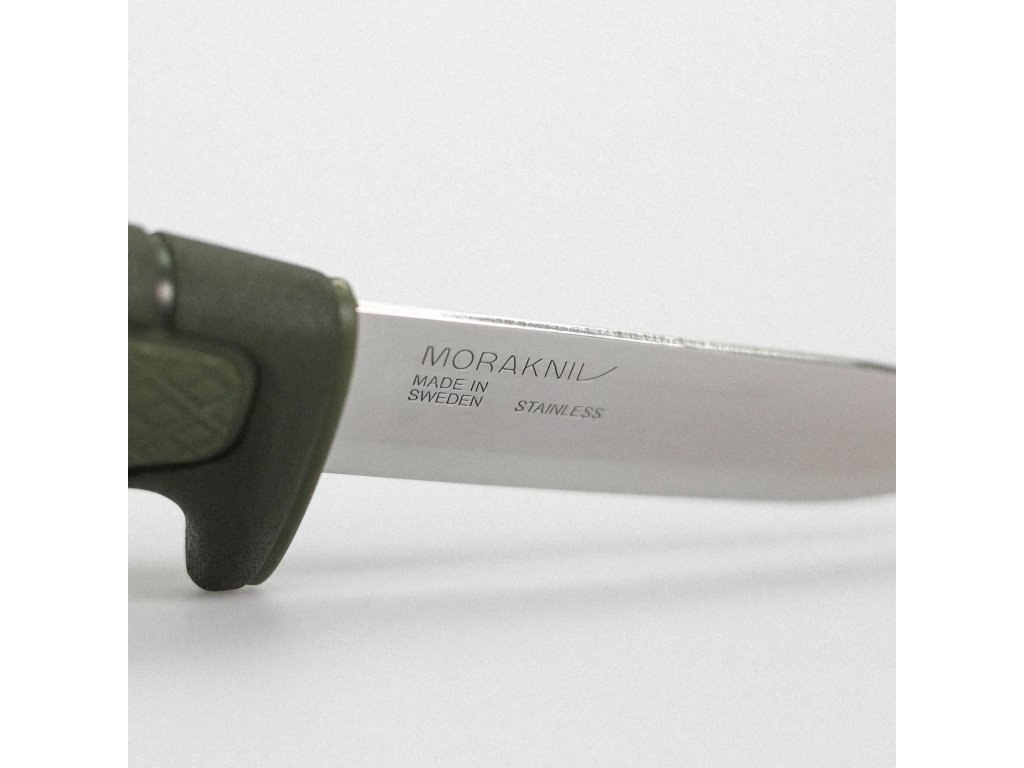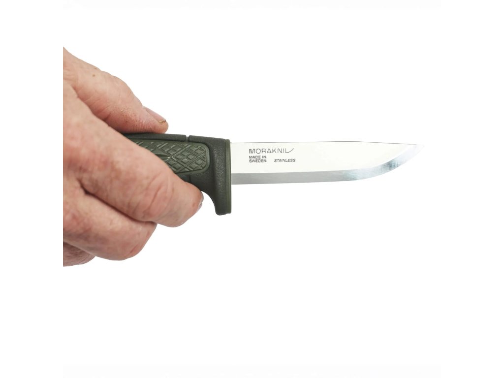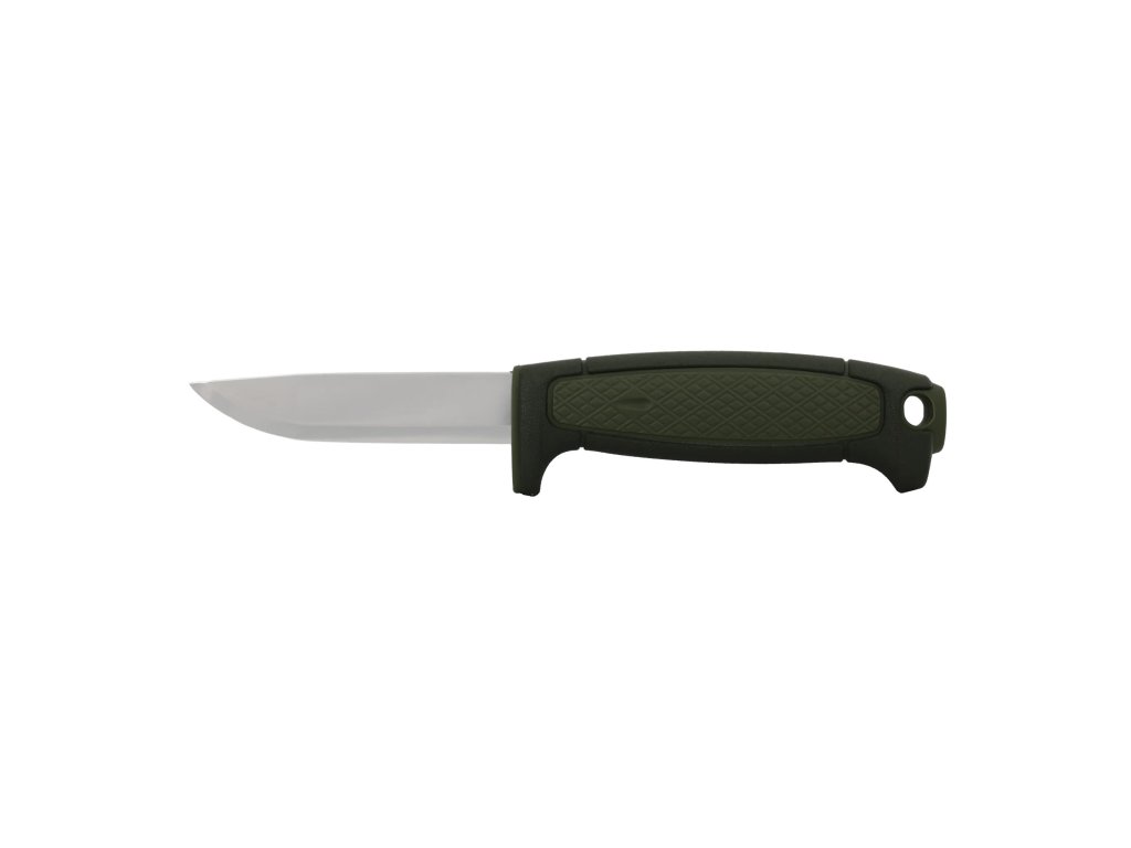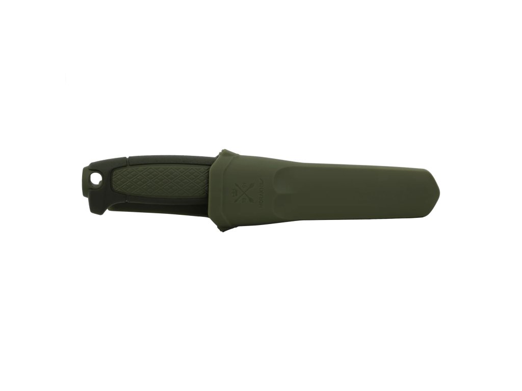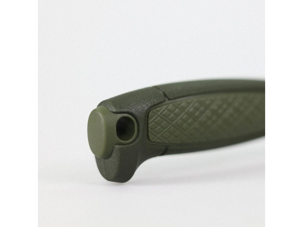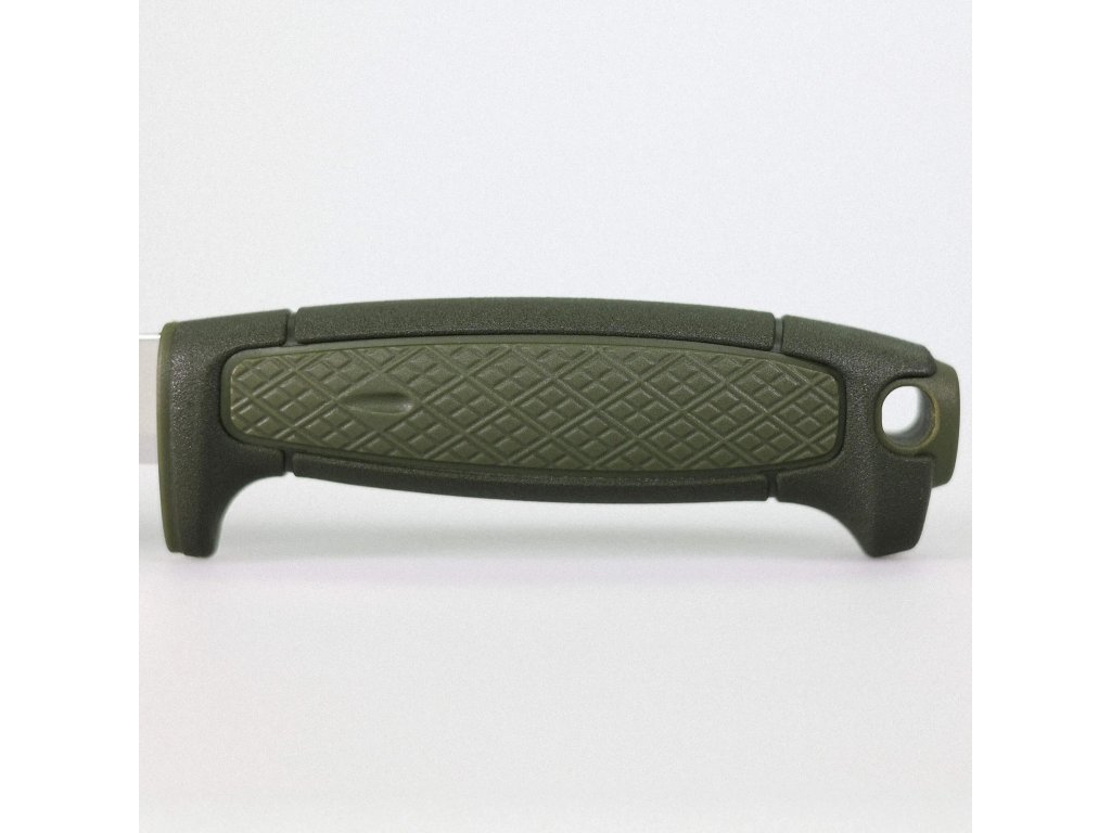 Válcovitá ergonomická rukojeť z odolného polypropylenu v tmavě zelené barevné kombinaci je inspirována klasickými řemeslnickými noži Morakniv. Na rukojeti se nachází plocha s protiskluzovou úpravou, na konci je otvor na paracord (lanyard hole).