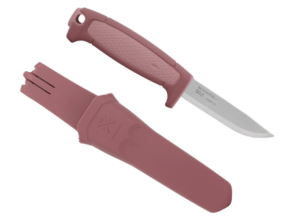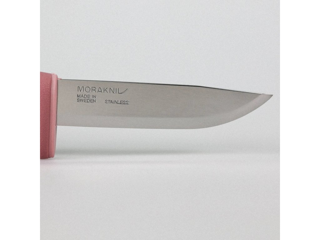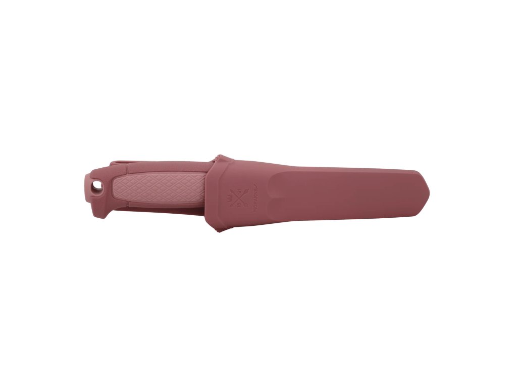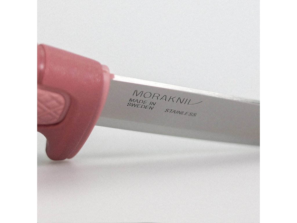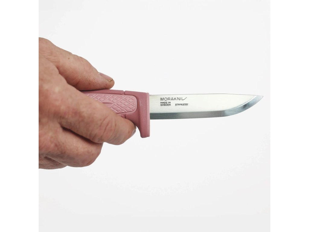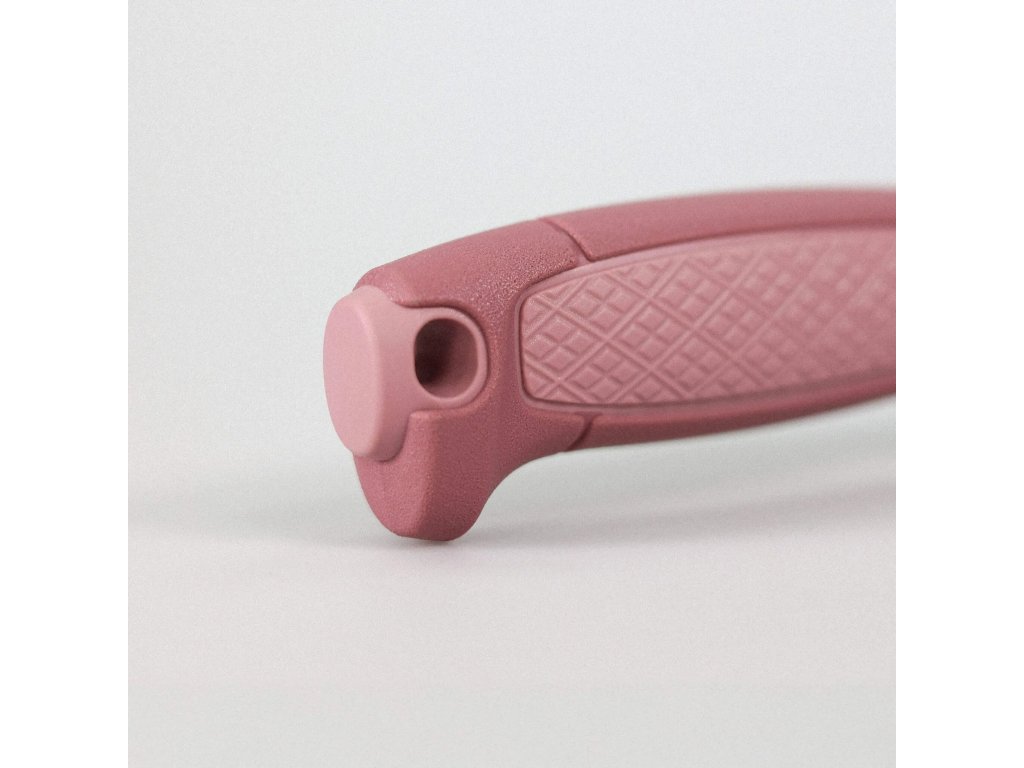 Válcovitá ergonomická rukojeť z odolného polypropylenu v tmavě a světle růžové barevné kombinaci je inspirována klasickými řemeslnickými noži Morakniv. Na rukojeti se nachází plocha s protiskluzovou úpravou, na konci je otvor na paracord (lanyard hole).