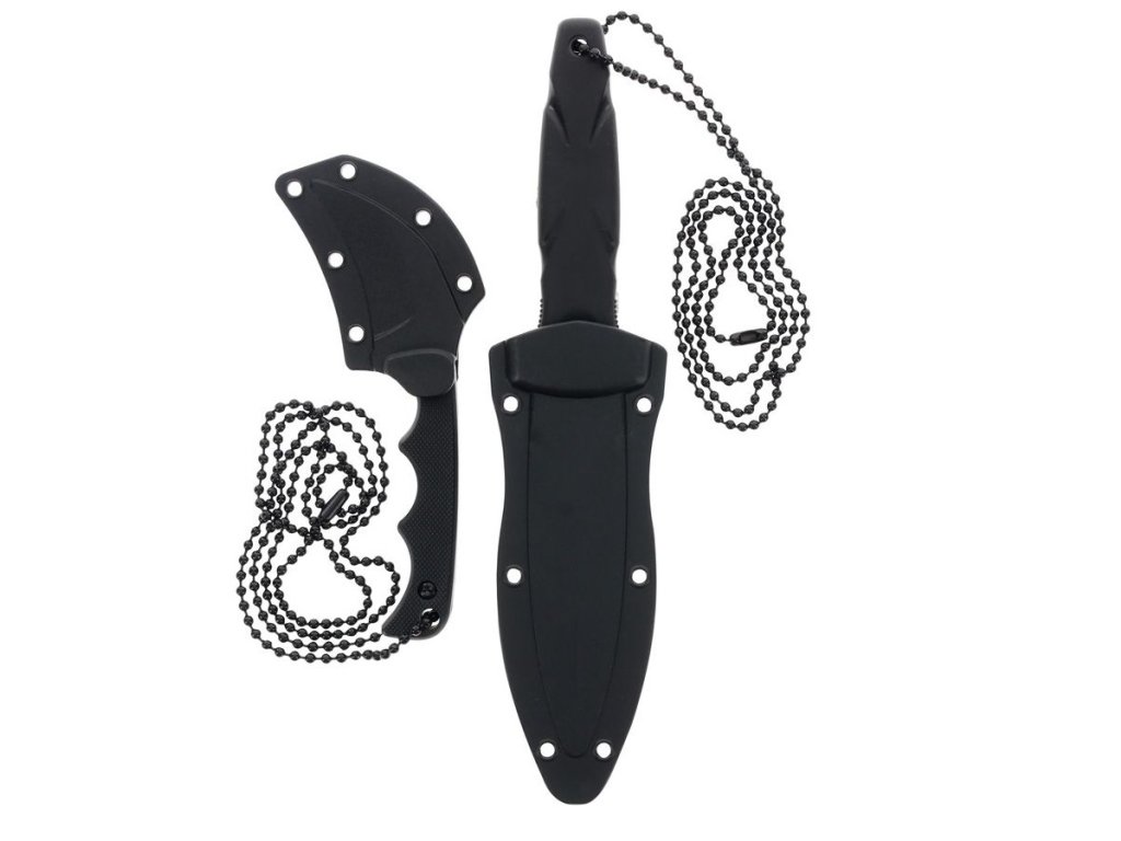 Karambit na krk (neck knife): Černá čepel délky 4,5 cm, celková délka 12,5 cm. Ergonomicky tvarovaná černá plastová rukojeť. Černé plastové pouzdro s řetízkem.