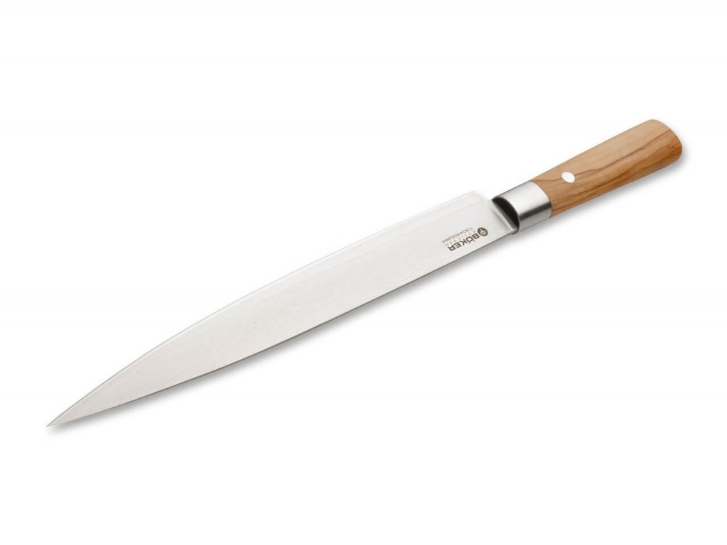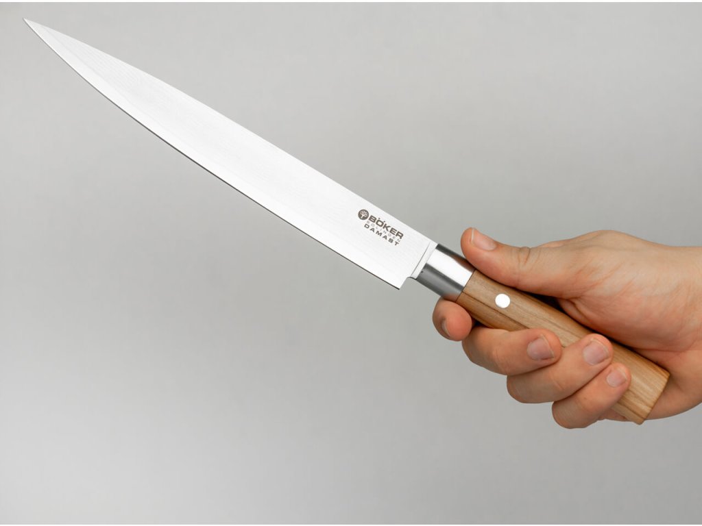 Plátkovací kuchyňský nůž Böker Damascus Olive s délkou čepele 22,9 cm je díky použitým materiálům určen převážně pro mistry šéfkuchaře, ale radost udělá každému milovníkovi dobré kuchyně. Zpříjemněte si chvilky v kuchyni s profesionálními kuchyňskými noži Böker.