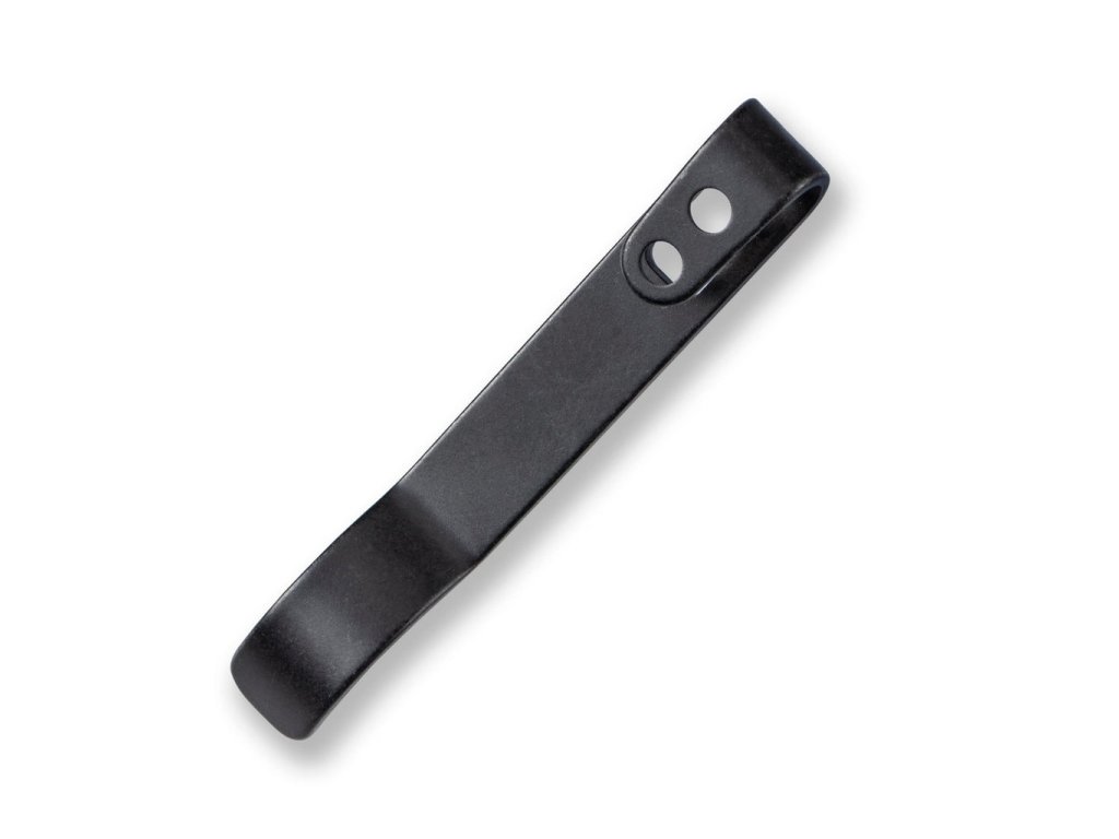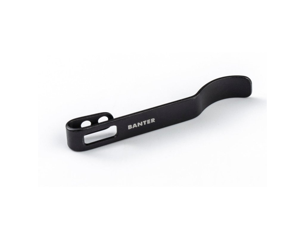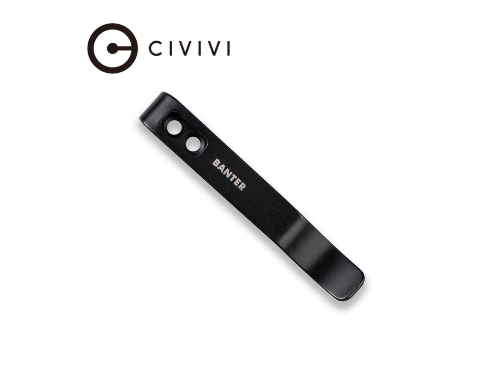 Černý kapesní klip z nerezové oceli pro nůž Civivi Baby Banter a We Knife Banter. Dva otvory pro šrouby o průměru 2,6 a 4,5 mm.