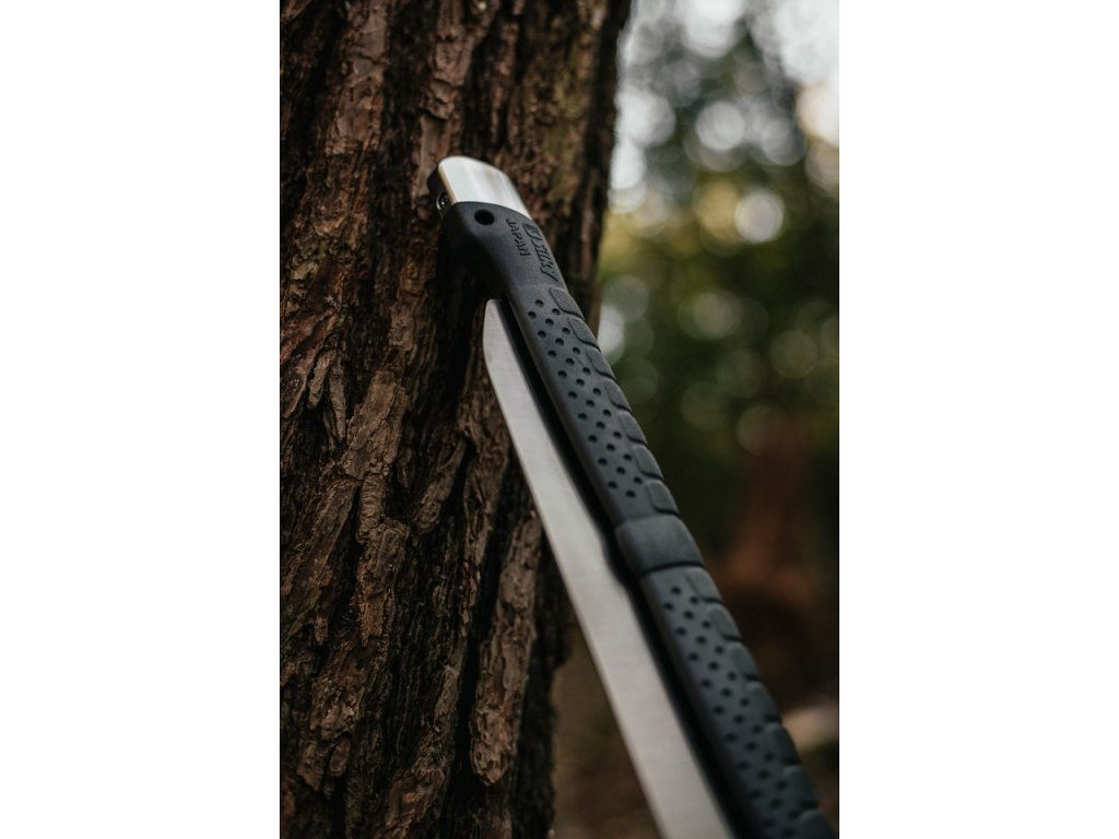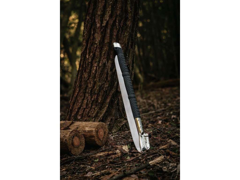 Skládací pilka na stromy a větve Katanaboy 550-5 je ideálním nástrojem pro náročné úkoly, jako je údržba chodníků, řezání dřeva nebo stavba přístřešku při kempování v lese. Je to plně funkční, výkonná tahací pila, vybavená čepelí v délce 55 cm, která s lehkostí prořízne kmeny stromu. Čepel je vyrobena z uhlíkové oceli SK4. Celková délka pily je 125 cm v otevřené formě. V té uzavřené nástroj měří 70 cm. Budete překvapeni, kolik málo energie je třeba vynaložit k dosažení skvělých výsledků s tímto praktickým nástrojem. Silná čepel je vybavena agresivní konfigurací zubů a je extrémně odolná. Hustota zubů pily Katanaboy 550-5 je 5 zubů na 3 cm. Zuby jsou unikátně vybroušeny a dlouho si udržují ostrost. S pomocí tlačítka můžete tuto pilu rychle a jednoduše rozložit a složit. Ergonomická gumová rukojeť absorbuje vibrace. Když používáte Katanaboy s oběma rukama, uvolníte ramena a zlepšíte výkon řezání. Celková hmotnost produktu je 1200 g. Katanaboy se dodává spolu s praktickou nylonovou taškou na rameno se zapínáním na suchý zip. Taška má extra kapsu na náhradní čepel.
