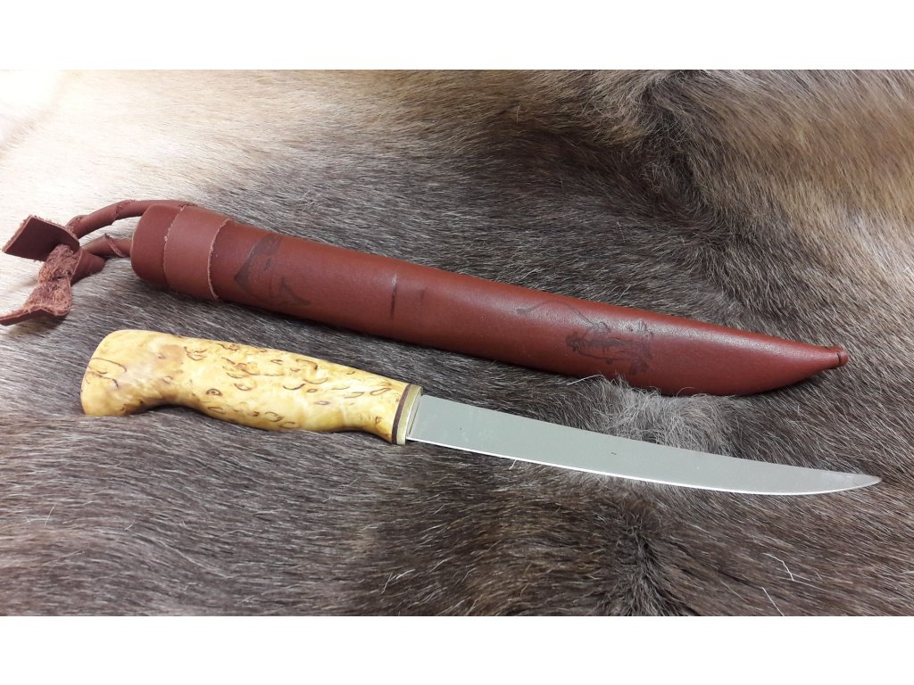 Filetovací nůž Wood Jewel Fileerausveitsi je ideálním nožem pro filetování středních až velkých ryb. Čepel je vyrobena z nerezové oceli a má správnou míru flexibility, která usnadňuje filetování. Měkčí povaha této oceli umožňuje, aby se čepel ohýbala bez lámání a bez námahy klouzala, aby vytvořila perfektní filet. Rukojeť ze dřeva kadeřavé břízy s mosazným zakončením. Kožené pouzdro s rybím motivem.