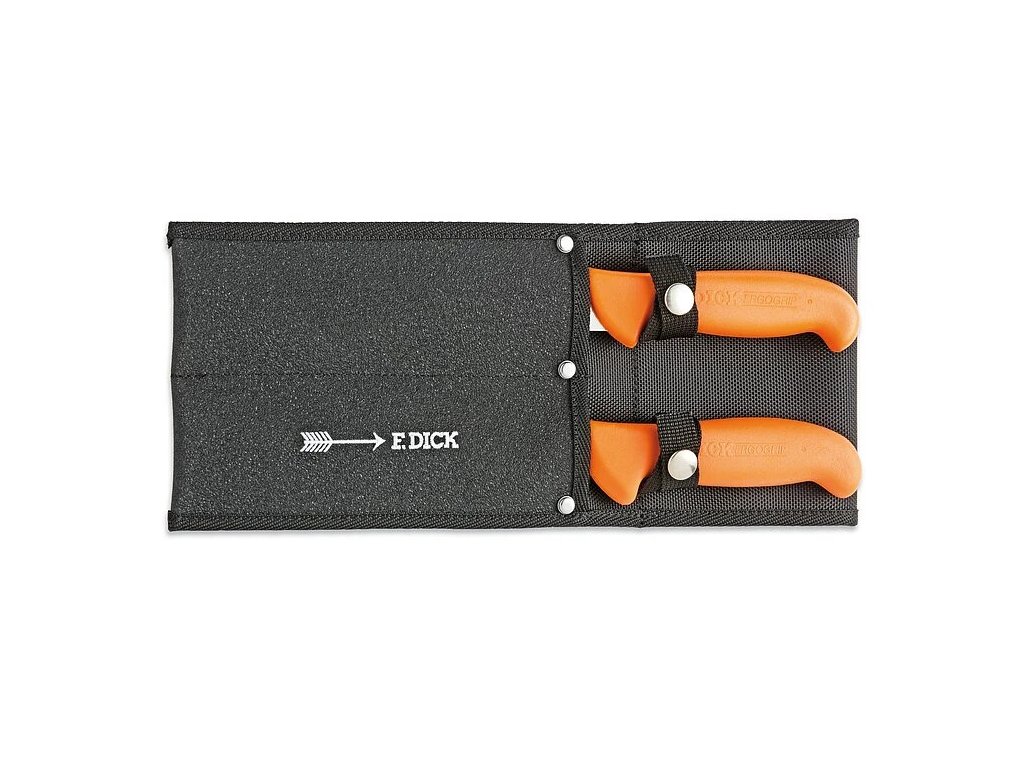 Profesionální sada řeznických nožů F. Dick ErgoGrip 82556306 je určena pro lovce a myslivce na zpracování úlovku. Obsahuje 2 základní nože potřebné pro práci s masem (vykosťovací a nůž na vnitřnosti) v praktickém textilním pouzdře.