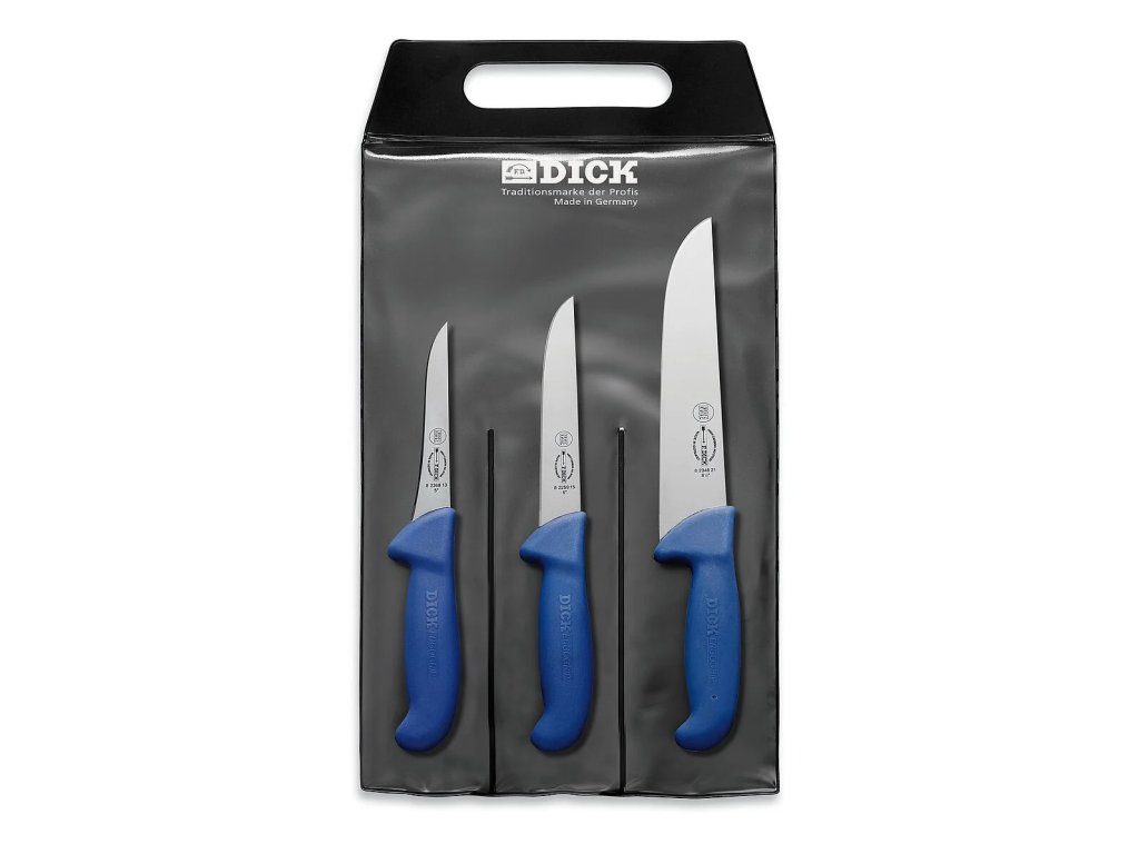 Profesionální sada řeznických nožů F. Dick ErgoGrip 8255900 je ideální pro začátečníky i zkušené kuchaře a řezníky. Obsahuje 3 základní nože potřebné pro zpracování masa (vykosťovací se širokou čepelí, vykosťovací s úzkou čepelí a blokový nůž).