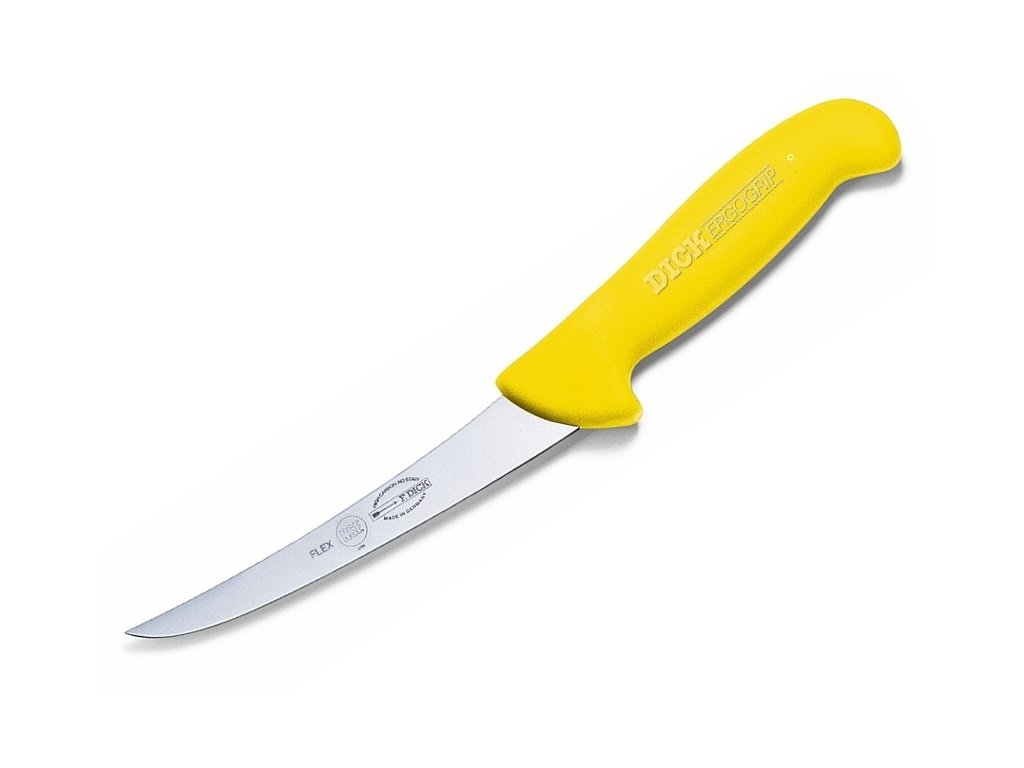 Profesionální řeznický nůž F. Dick ErgoGrip 8298113-02 s flexibilní zahnutou čepelí délky 13 cm z nerezové oceli X55CrMo14 o tvrdosti 56 HRC slouží k vykosťování a zpracování masa. Vyznačuje se ergonomickou rukojetí ze žlutého plastu pro pohodlný a bezpečný úchop i v mokrém prostředí. Mezi čepelí a rukojetí se nenacházejí žádné spáry, ve kterých by se mohly zachytit tekutiny. Rukojeť neabsorbuje mastnotu ani nečistoty.