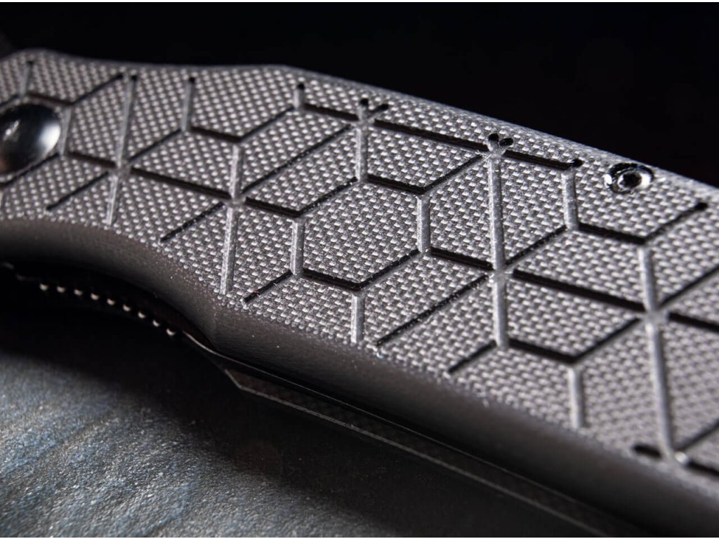 Rukojeť je z černé G10 s moderním vzorem včelího plástu, který zaručuje bezpečný úchop i v nepříznivém počasí. Je orámována červenou hliníkovou rozpěrou, která je ukončena otvorem na paracord. Na konci rukojeti se nachází rozbíječ skla. Černý kapesní klip umožňuje také hluboké nošení (deep carry).