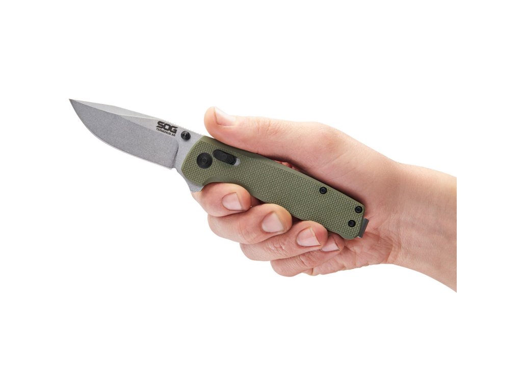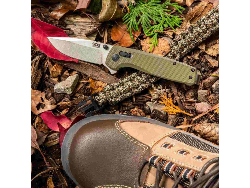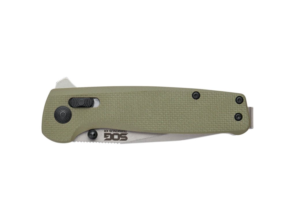 SOG Terminus XR je odolný, zavírací nůž pro každodenní nošení. Rukojeť je vyrobena z olivově zelené G10. Terminus je středně velký EDC s pojistkou SOG XR Lock. Čepel z kryogenně upravené nástrojové oceli D2 s plochým výbrusem, délkou 7,5 cm a stonewash povrchovou úpravou při celkové délce nože 18,3 cm. Oboustranný klip z nerezové oceli pro zavěšení nože umožňuje hluboké zavěšení, díky čemuž nůž v kapse nepoutá pozornost.